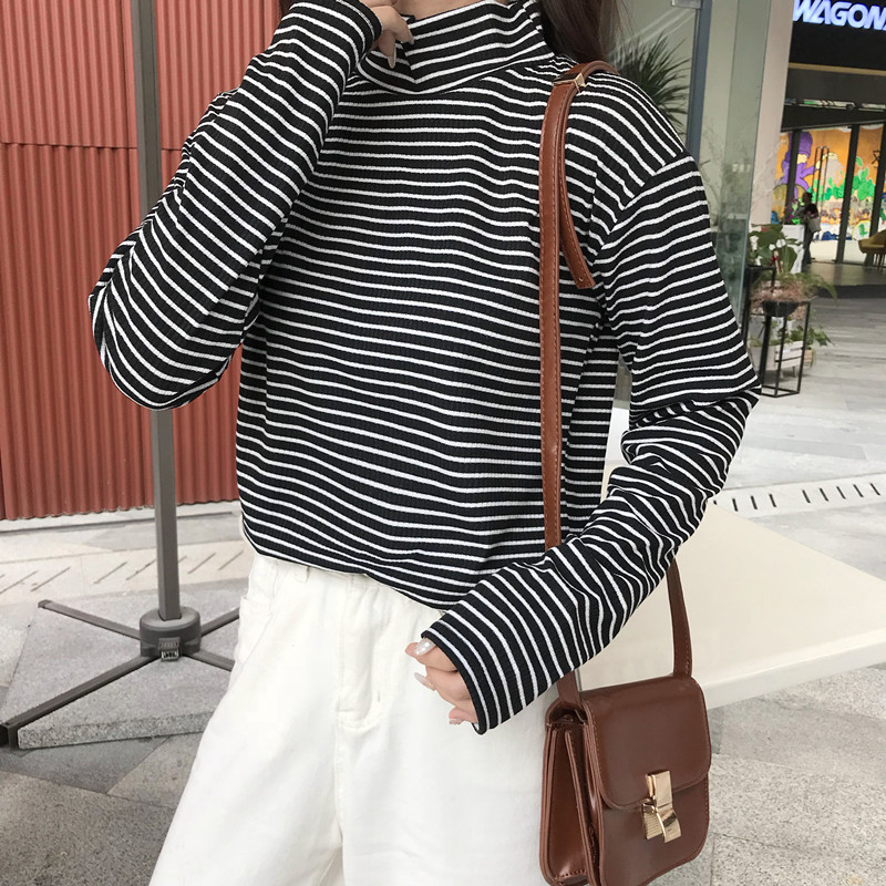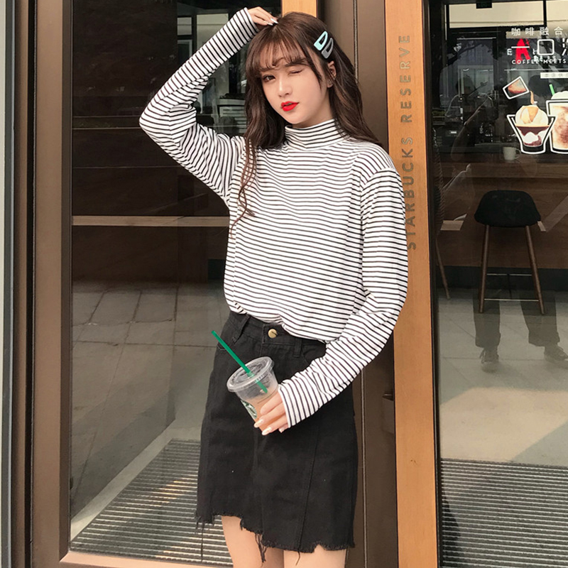 高領條紋打底衫秋裝女2018新款學生T恤衣服修身顯瘦長袖體恤上衣
