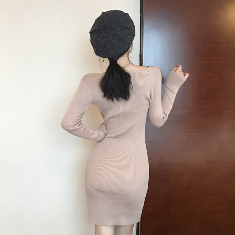 連衣裙女秋裝2018新款時尚v領修身中長裙系帶開叉針織打底包臀裙
