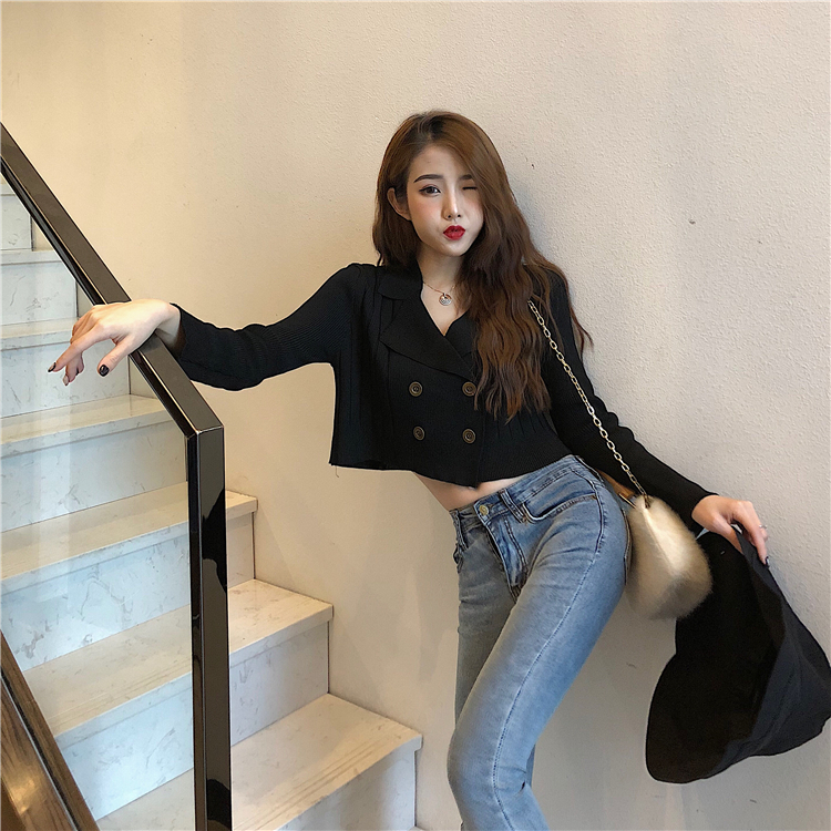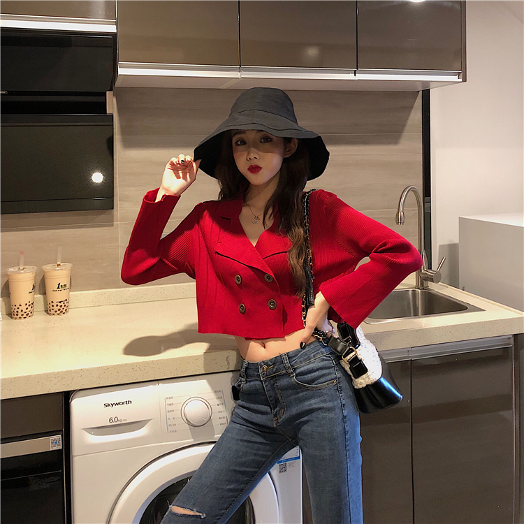 / 晚晚風網紅同款新款修身復古chic針織衫短款長袖西裝領顯瘦上衣女