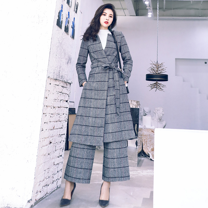 名媛氣質2018新款毛呢套裝女秋裝時尚顯瘦闊腿褲長系帶外套冬