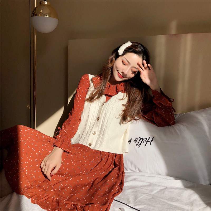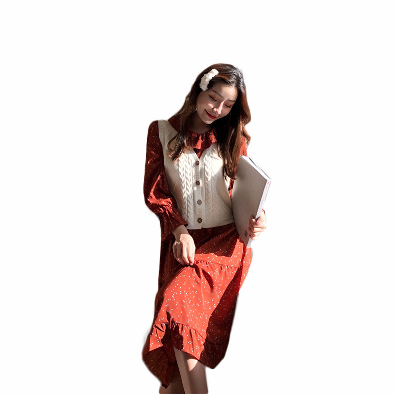 / 韓國鬼馬少女系甜美木耳邊收腰大擺裙+森系麻花毛衣馬甲時尚套裝