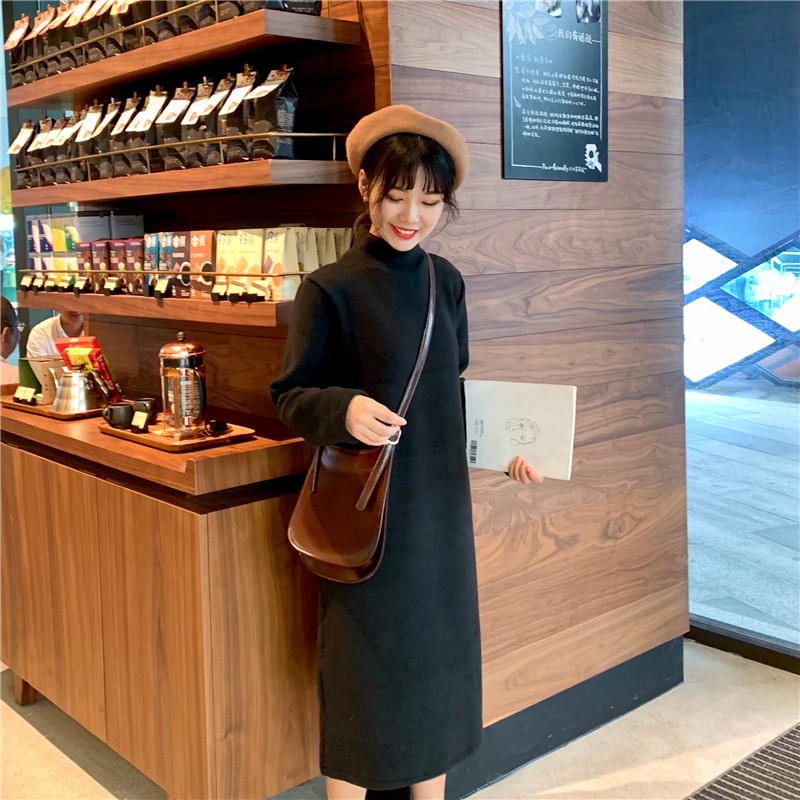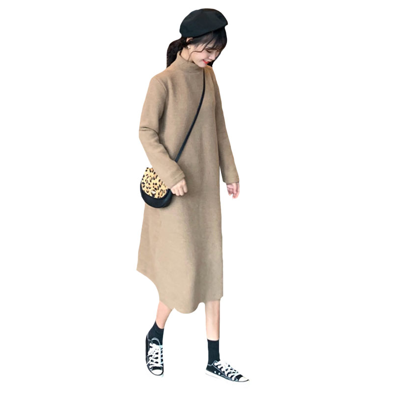 / 秋冬女裝韓版中長款寬松打底裙純色半高領長袖連衣裙長裙學生裙子