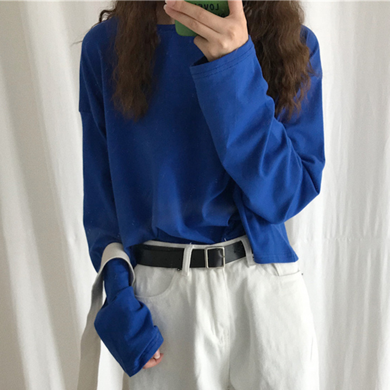 慵懶簡約純色長袖T恤秋裝女2018新款韓版寬松圓領短上衣學生體恤