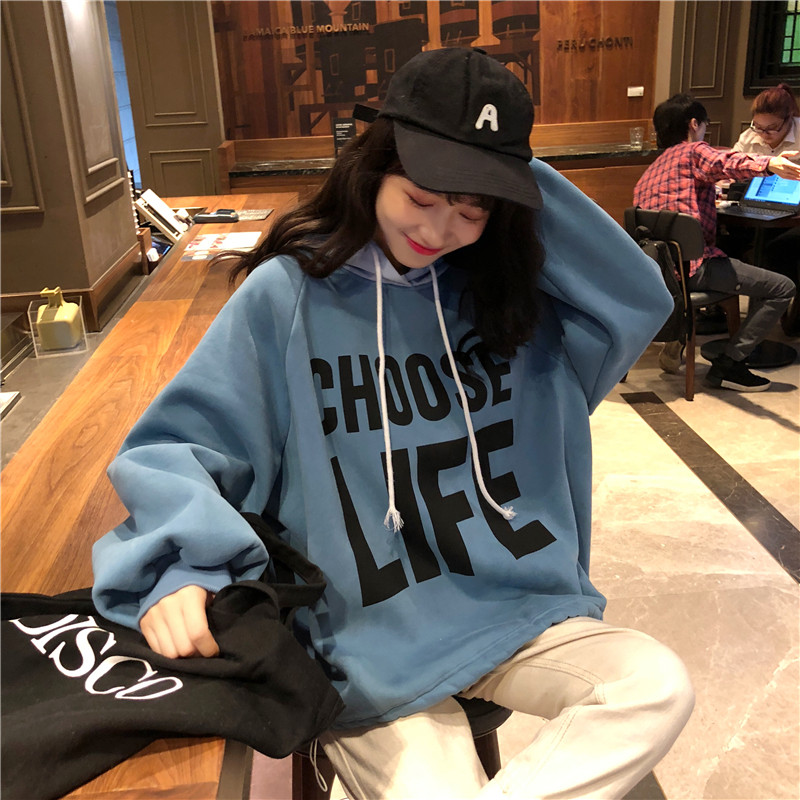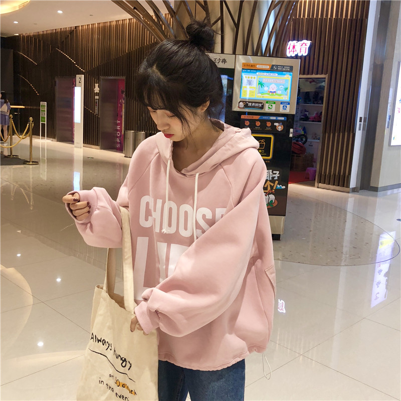 / 2018新款秋冬韓版慵懶風加絨加厚字母撞色口袋連帽衛衣上衣外套女