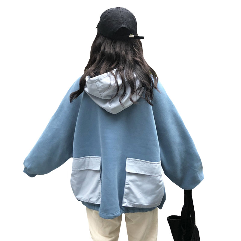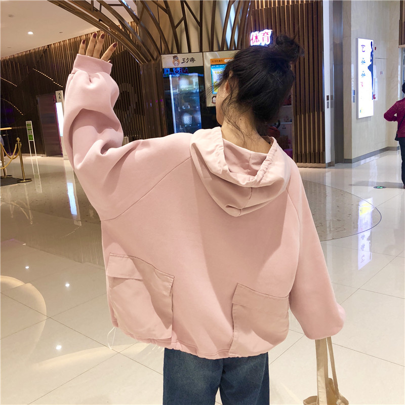 2018新款秋冬韓版慵懶風加絨加厚字母撞色口袋連帽衛衣上衣外套女