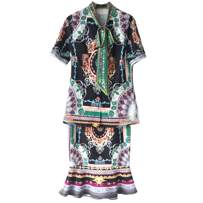 / 名媛歐洲站女神范裙子收腰顯瘦印花短袖蝴蝶結上衣半身魚尾裙套裝
