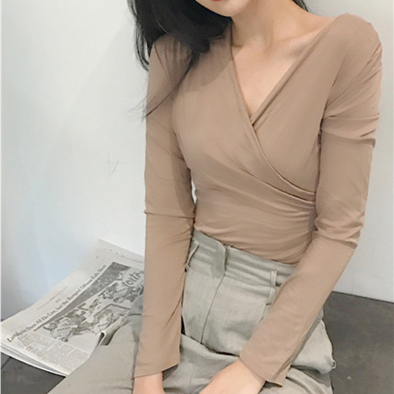 / 復古港味上衣新款氣質交叉深V領長袖T恤女春秋韓版修身顯瘦打底衫