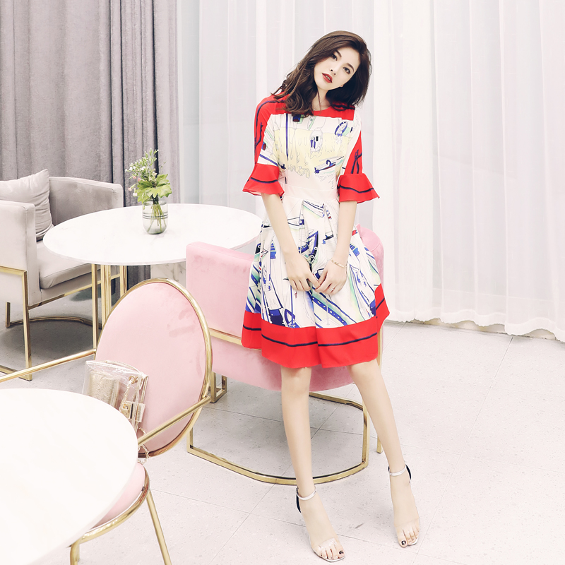 / 裙子名媛氣質夏女2018新款五分袖中長款大擺顯瘦復古印花連衣裙潮