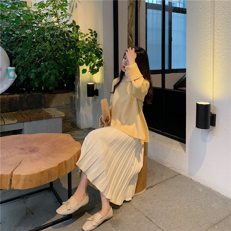 慵懶寬松毛衣套頭長袖針織衫上衣+中長款高腰百褶半身