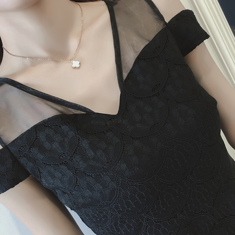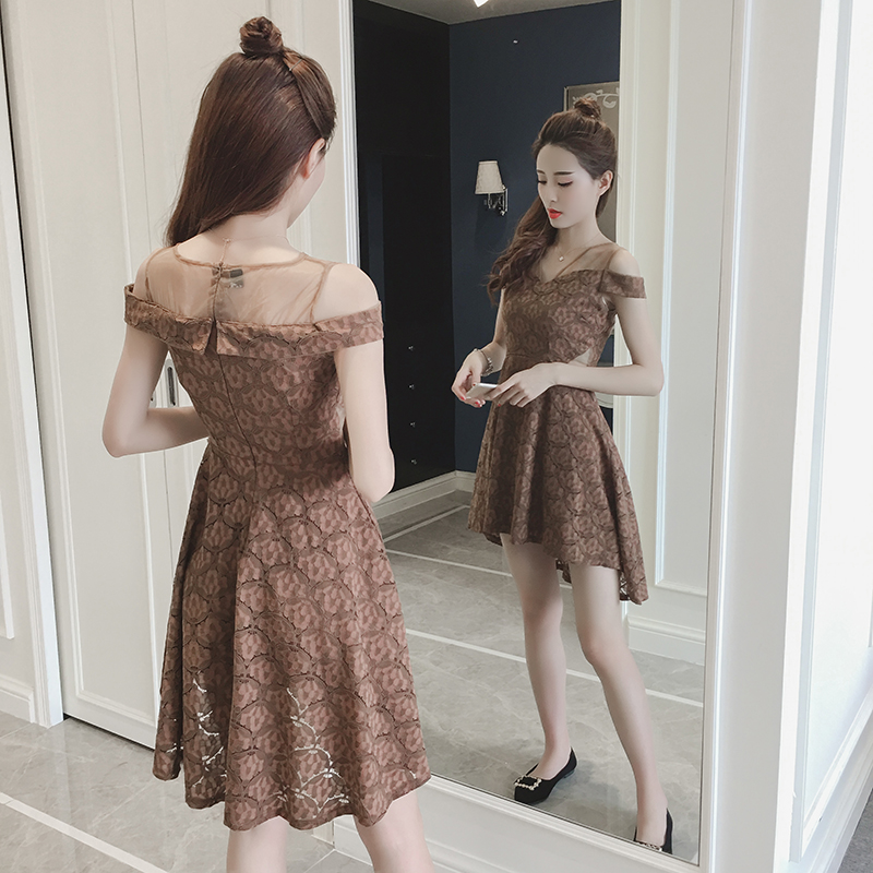 / 夏季新款性感露肩蕾絲拼接歐根紗裙子不規則收腰顯瘦連衣裙女