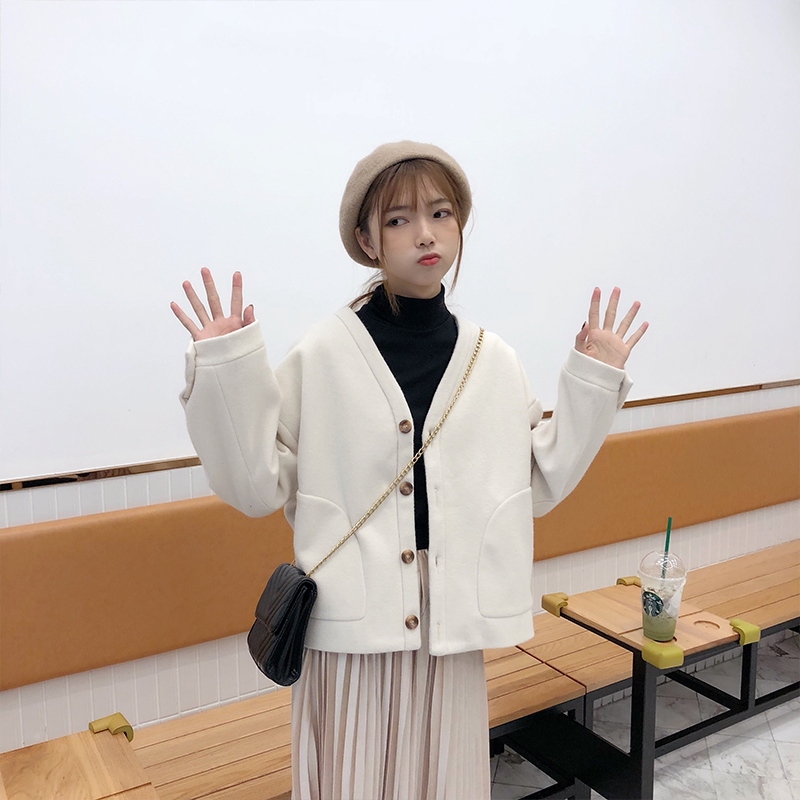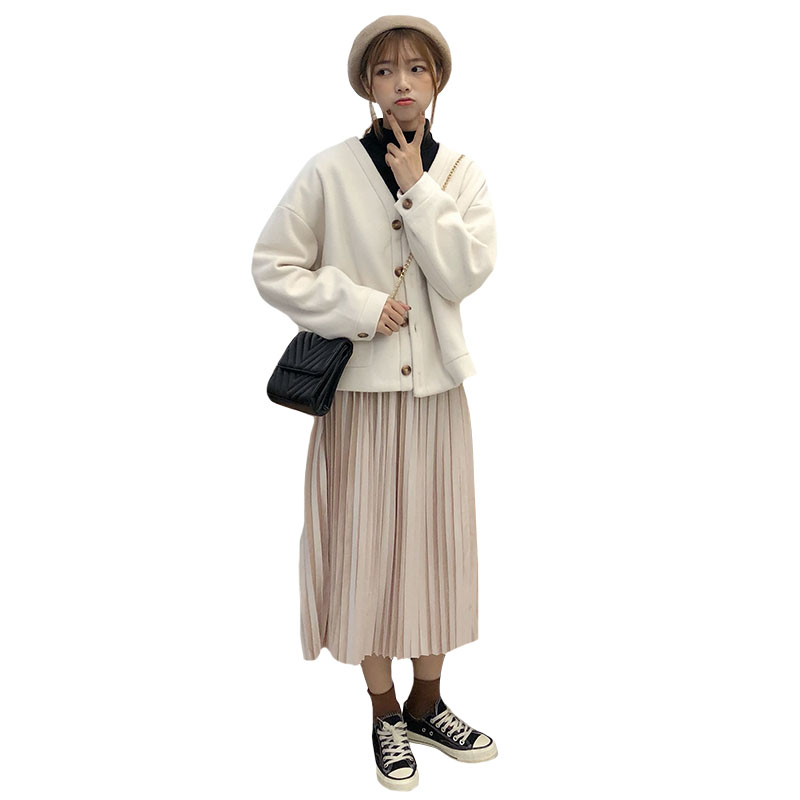 / 韓版時尚休閑套裝秋季女裝寬松V領呢子開衫外套+百褶半身裙兩件套