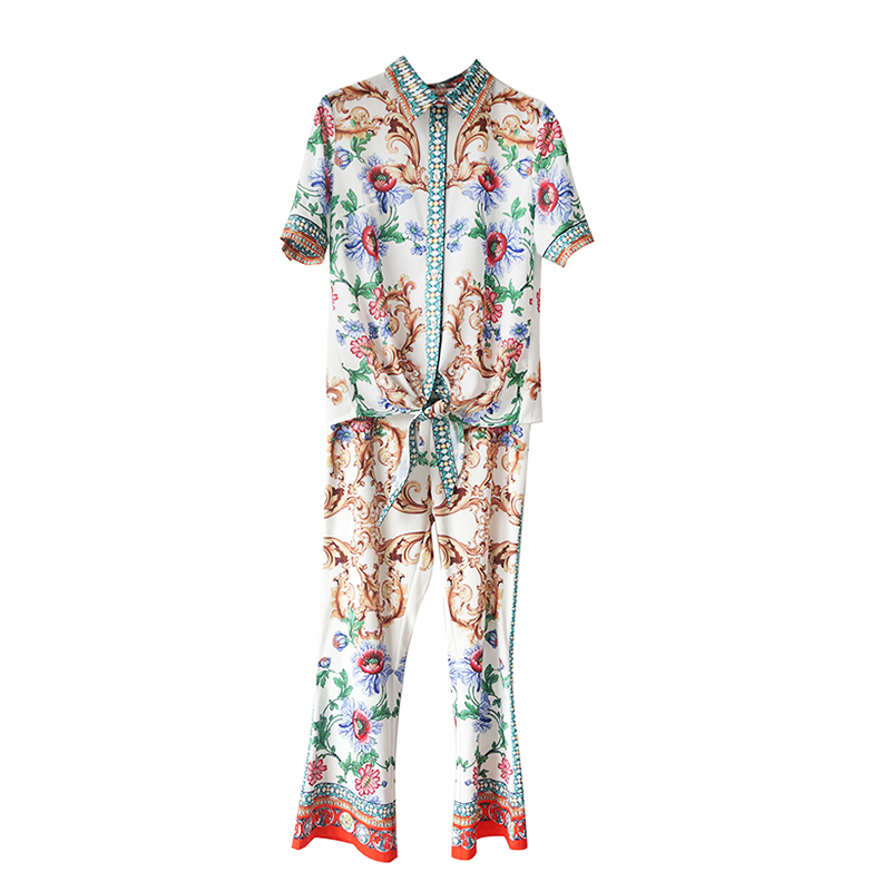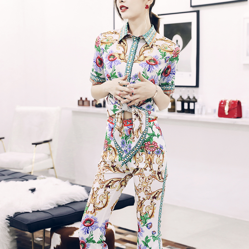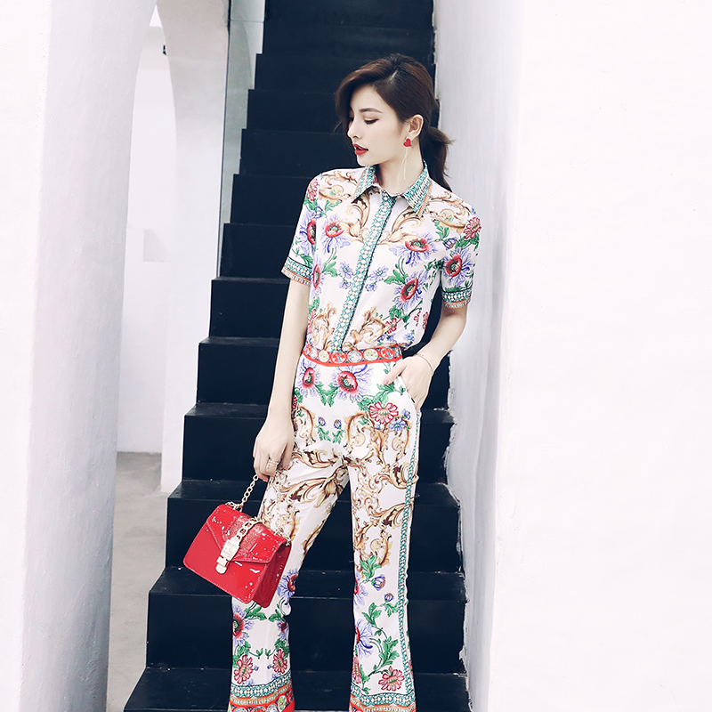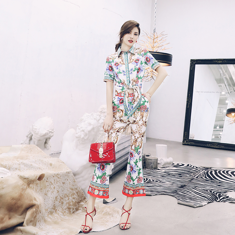 / 歐洲站2018夏季新款收腰短袖襯衫T恤微喇褲印花時尚套裝女兩件