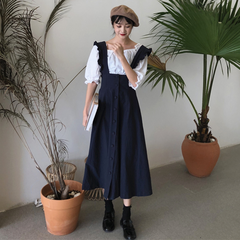 / 秋裝2018新款甜美學生木耳邊背帶連衣裙少女休閑純色中長A字裙子