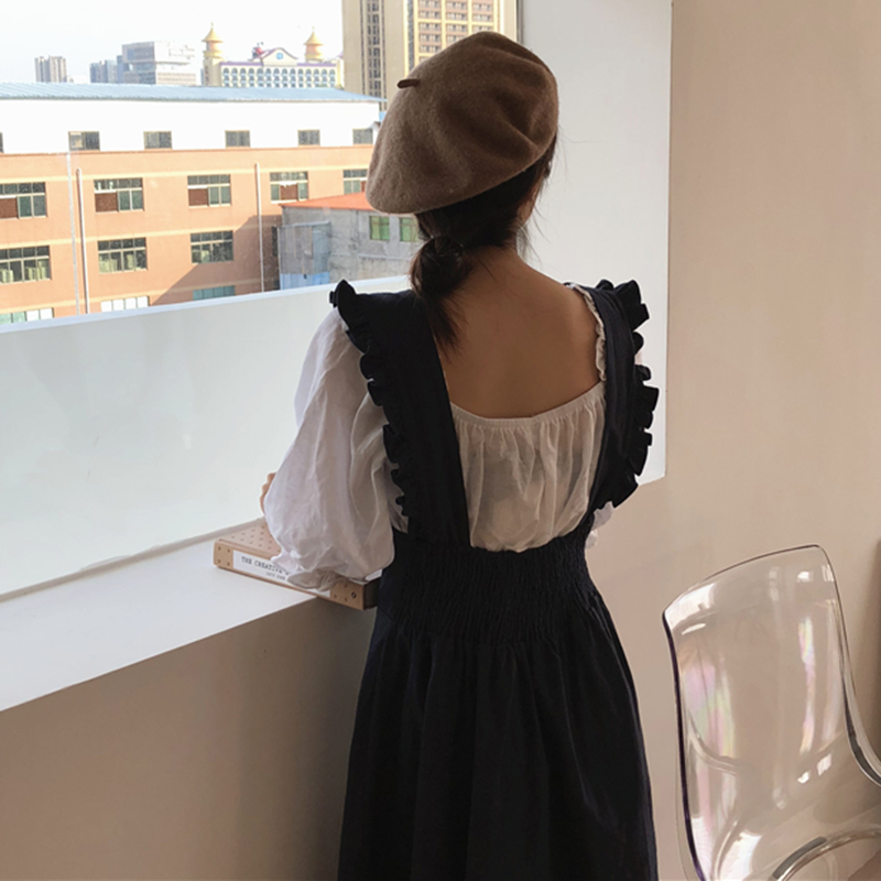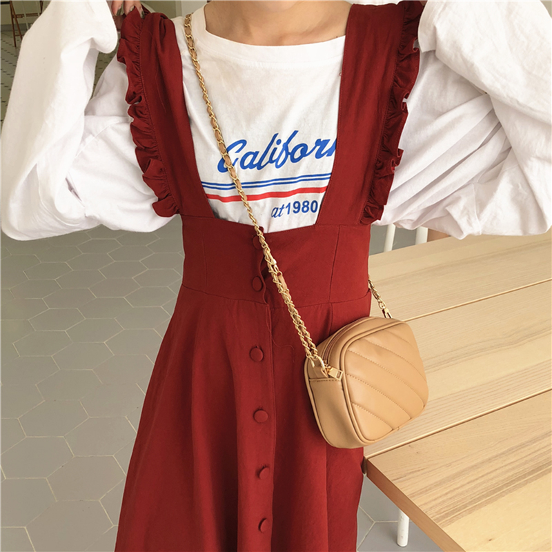 秋裝2018新款甜美學生木耳邊背帶連衣裙少女休閑純色中長A字裙子
