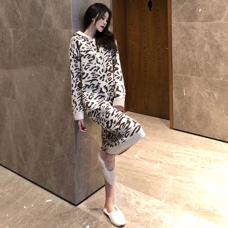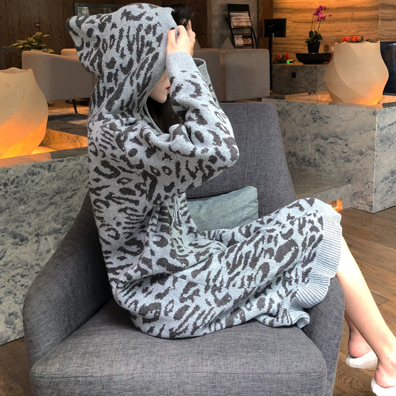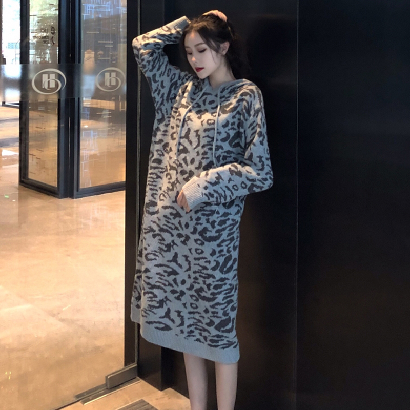 復古豹紋寬松長袖連帽針織連衣裙秋冬裝新款法式少女egg毛衣裙子
