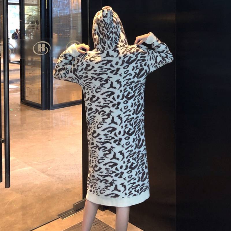 / 復古豹紋寬松長袖連帽針織連衣裙秋冬裝新款法式少女egg毛衣裙子