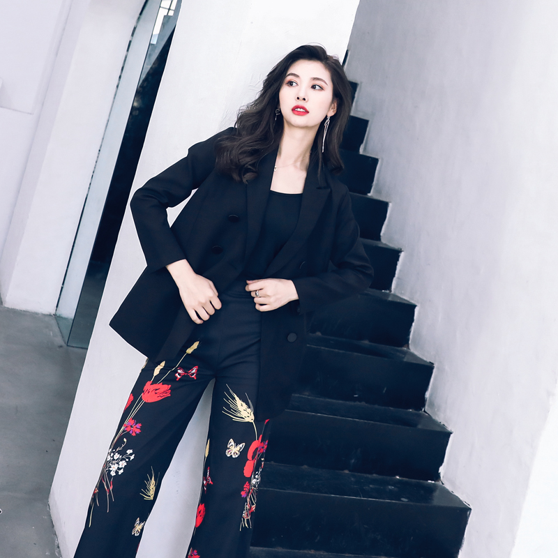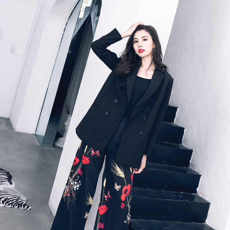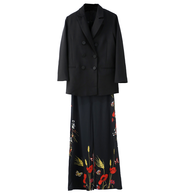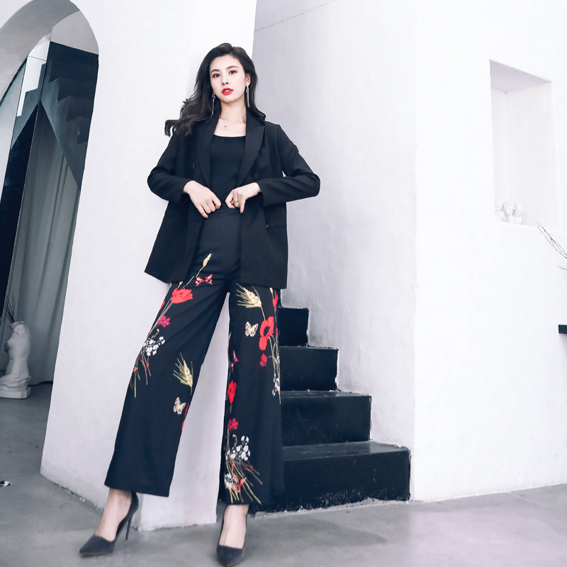 / 洋氣印花西裝套裝女秋裝2018新款時尚氣質闊腿褲復古港味兩件套