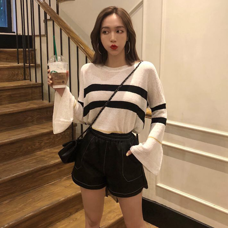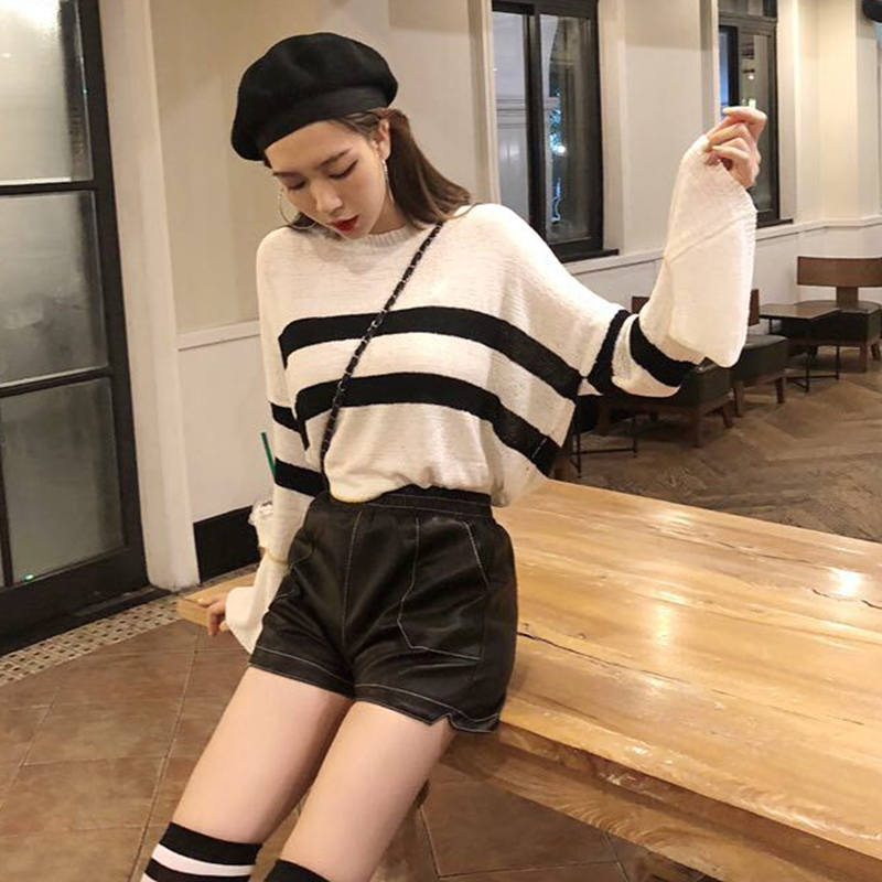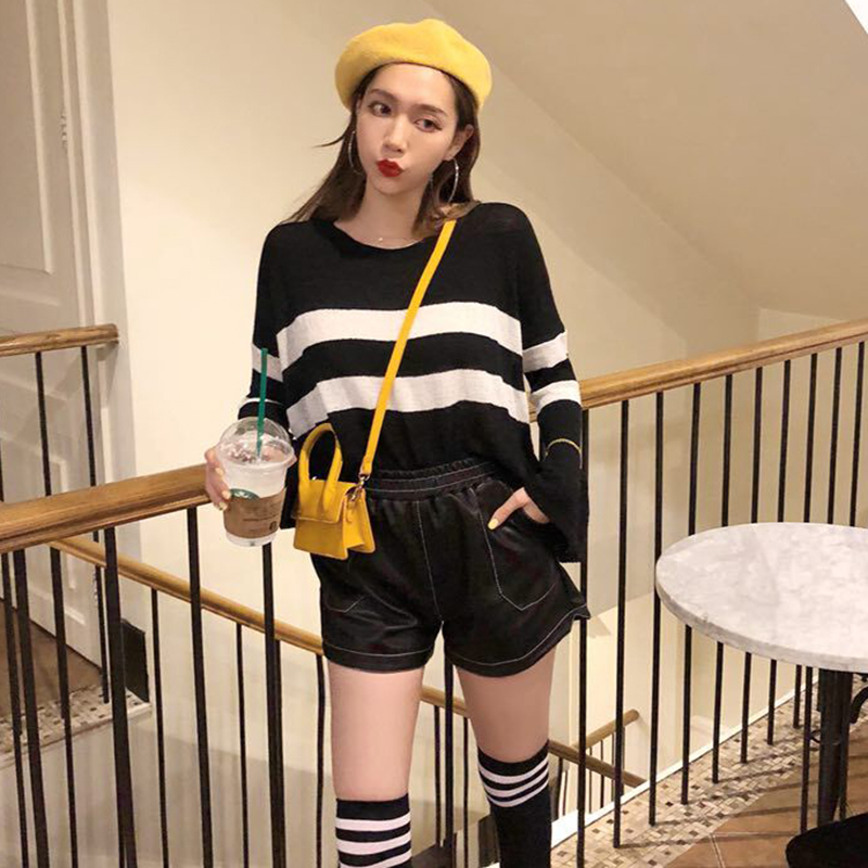 / 套裝女秋冬2018新款復古條紋打底襯衫高腰pu皮褲子學生時尚過膝襪