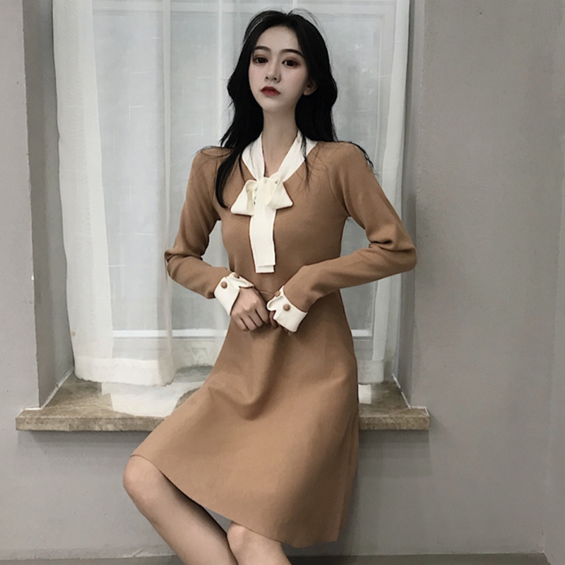 / 港味chic綁帶蝴蝶結裙子女秋冬裝2018新款氣質顯瘦針織A字連衣裙