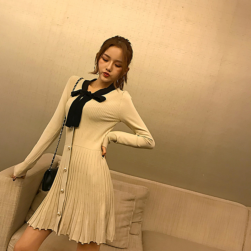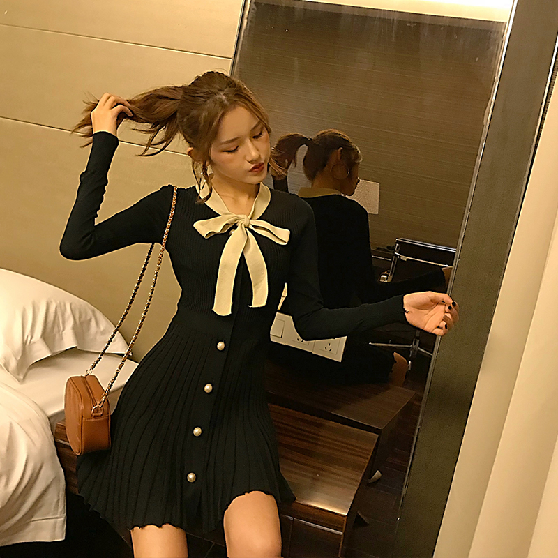/ 氣質時尚2018秋裝新款韓版女短裙蝴蝶結領口收腰顯瘦長袖連衣裙潮