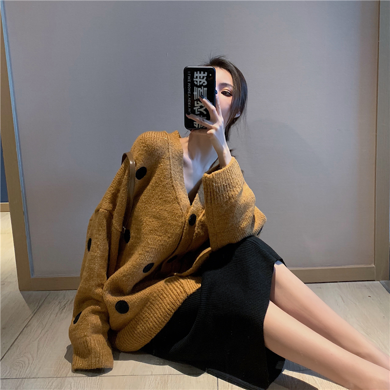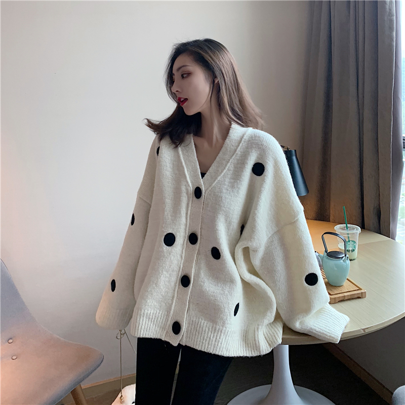 / 韓版秋冬時尚慵懶風毛衣女針織開衫外套寬松百搭V領波點繡花上衣
