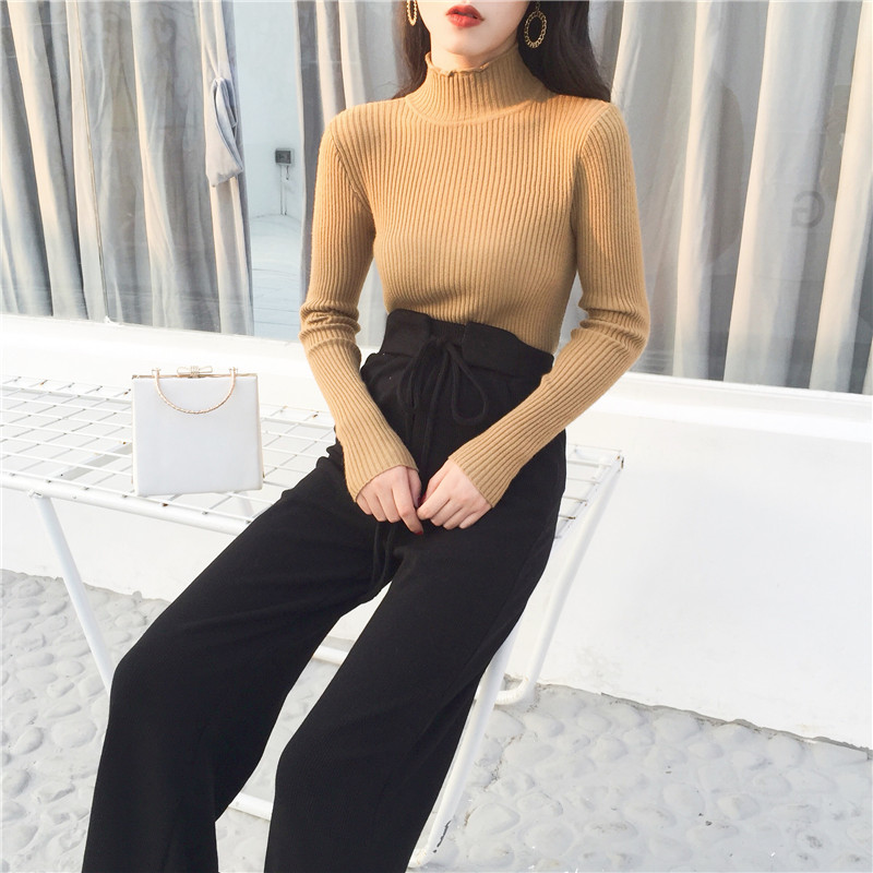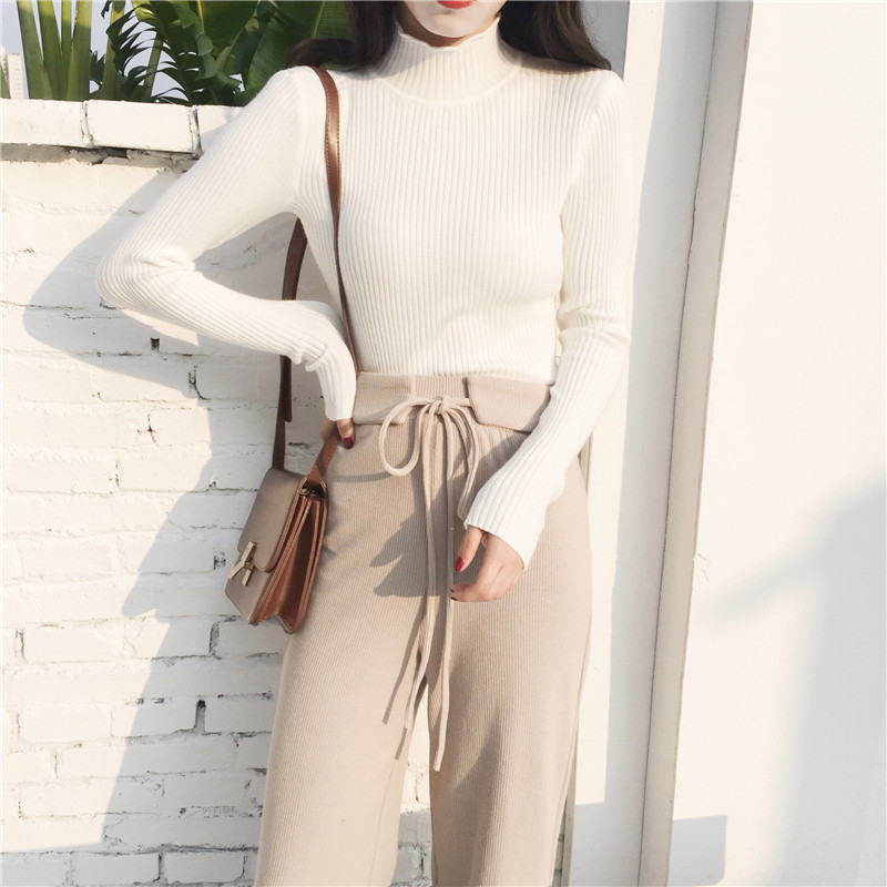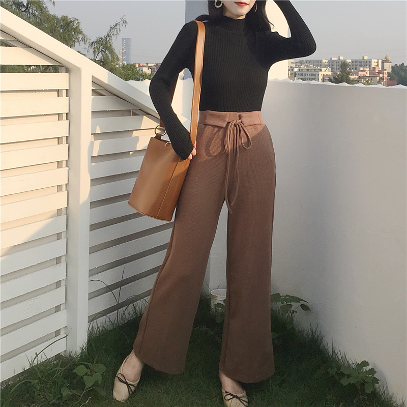 / 港味復古風2018秋裝新款修身顯瘦高腰系帶針織直筒長褲百搭闊腿褲