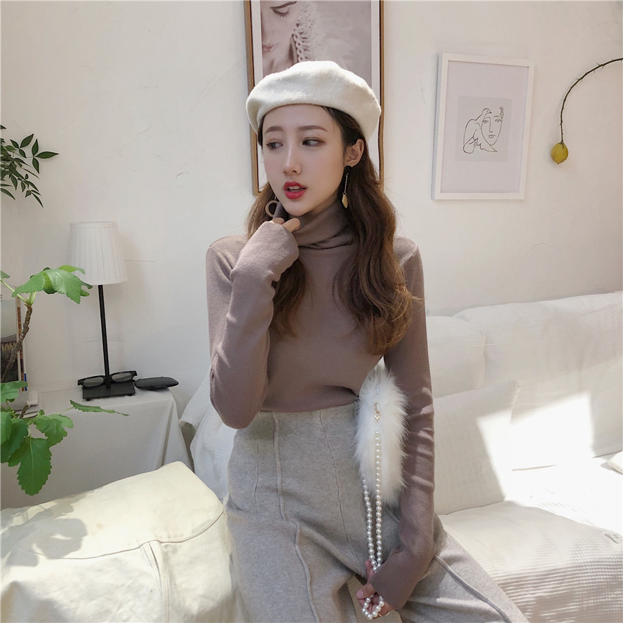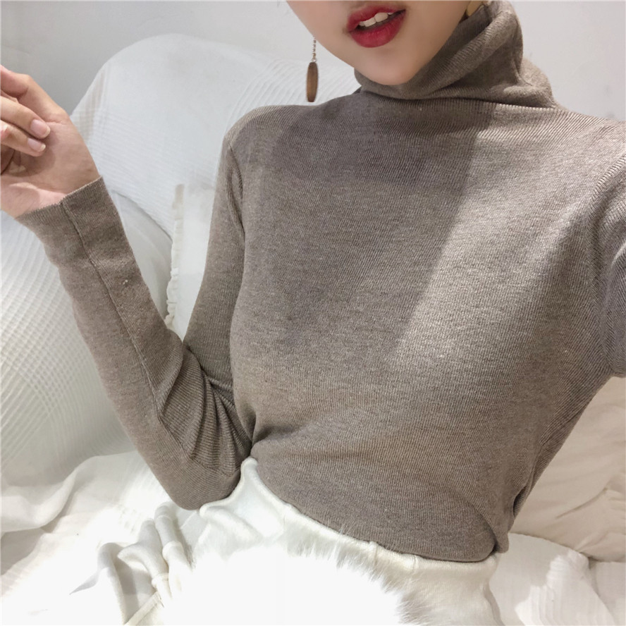 秋冬新款純色百搭高領堆堆領針織衫上衣chic復古簡約長袖打底衫女