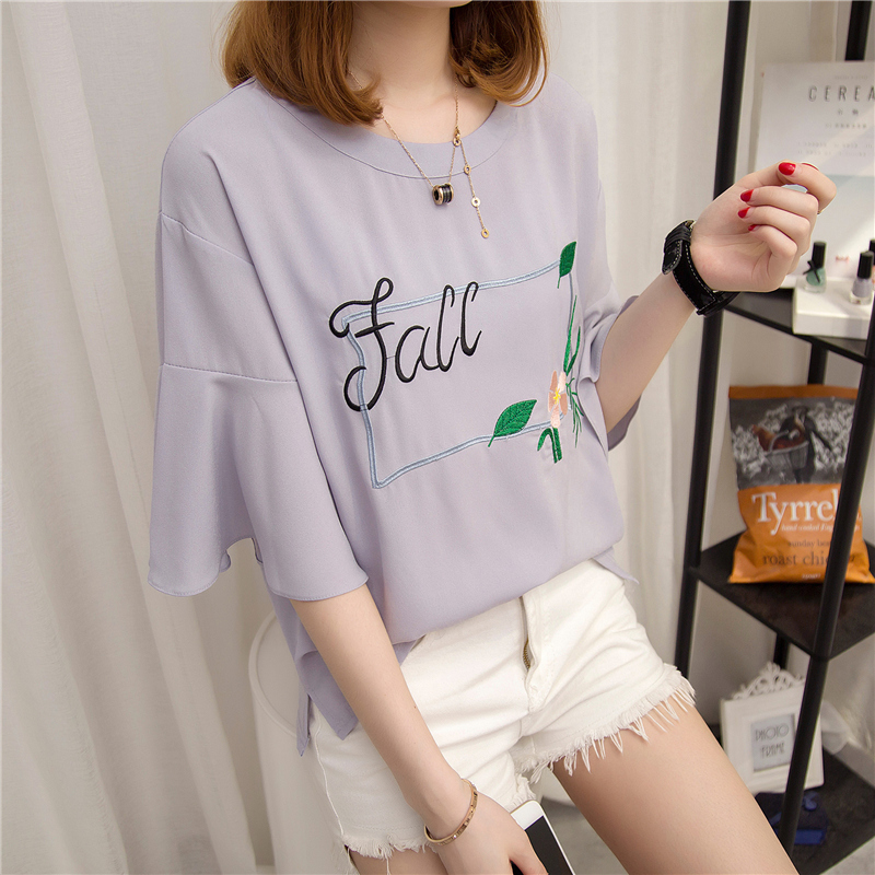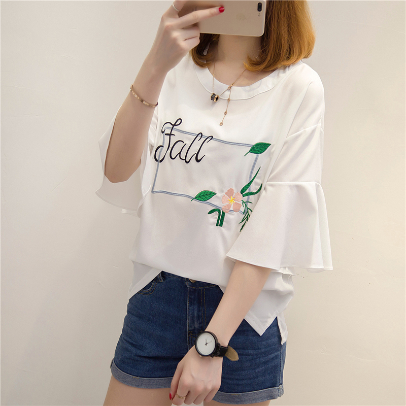 夏裝新款女白色t恤女荷葉袖韓版刺繡bf風小清新上衣體恤短袖