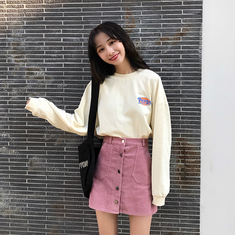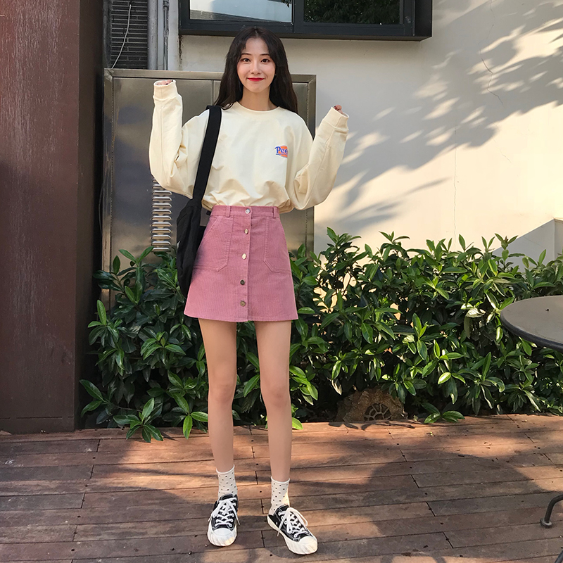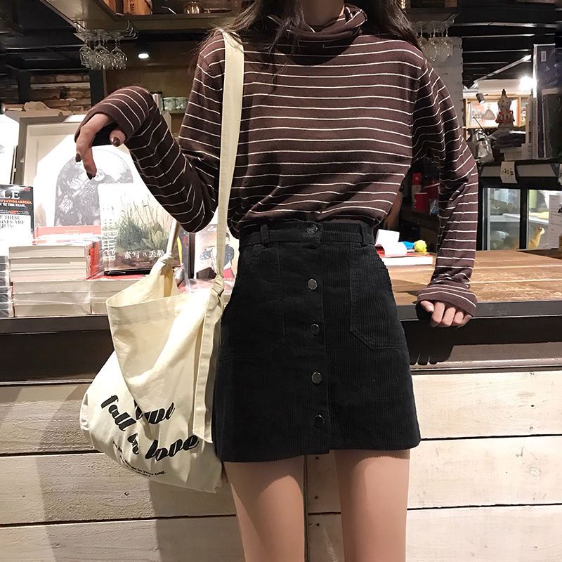 / 秋季2018新款女裝韓版燈芯絨半身裙學生裙子高腰單排扣a字裙短裙