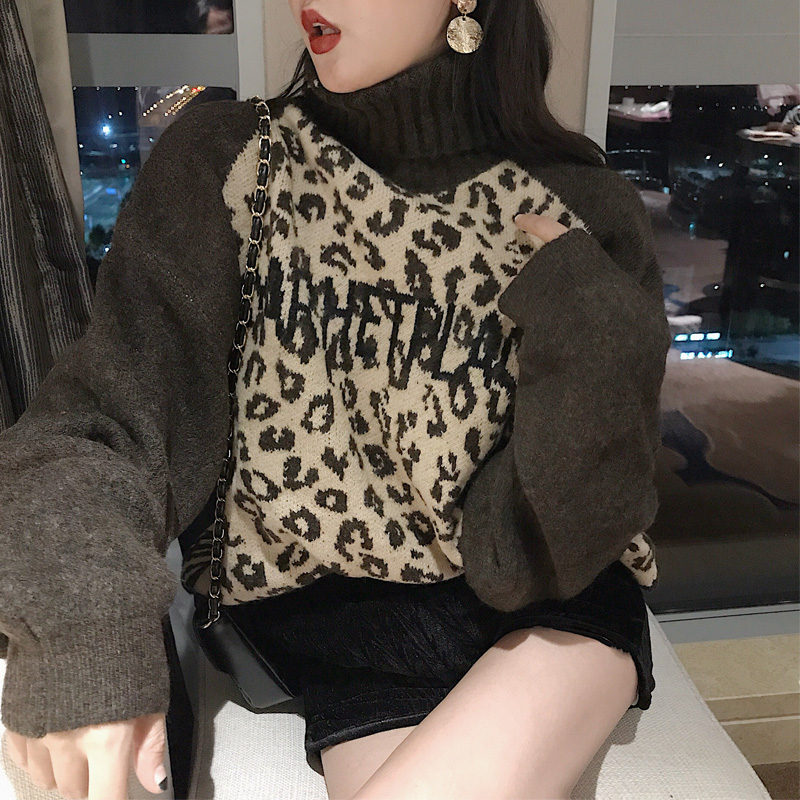 / 2018新款韓版秋冬季chic毛衣女裝高領豹紋拼接長袖套頭寬松針織衫