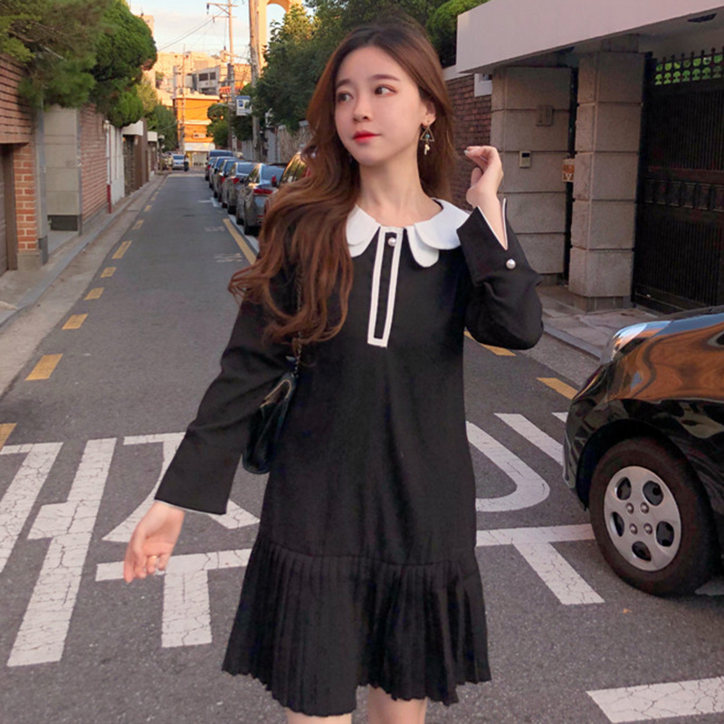 / 女秋裝新款韓版氣質娃娃領珍珠扣百褶連衣裙顯瘦黑色a字中長裙子
