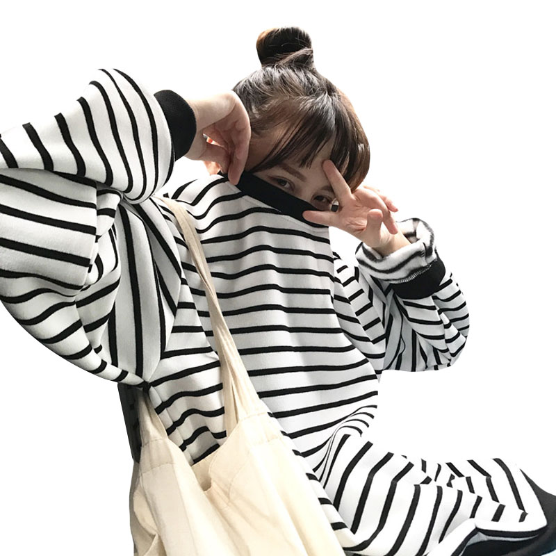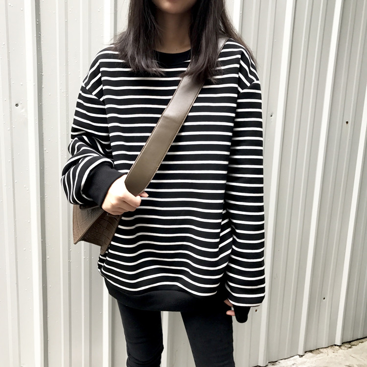 秋季女裝韓版中長款學院風寬松百搭條紋撞色長袖套頭衛衣上衣外套