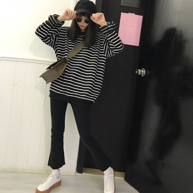 / 秋季女裝韓版中長款學院風寬松百搭條紋撞色長袖套頭衛衣上衣外套