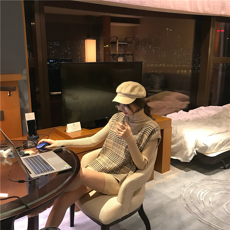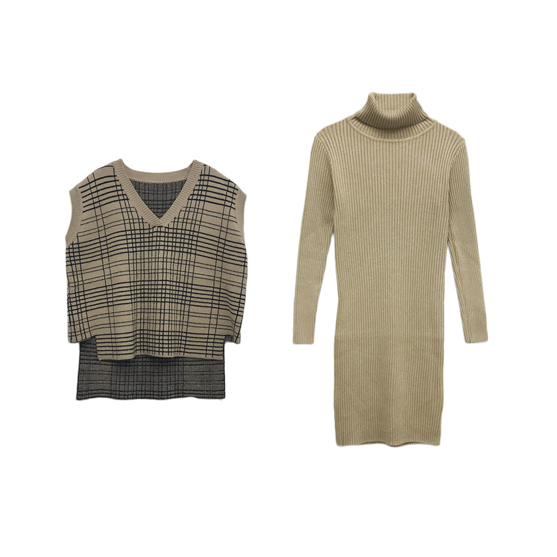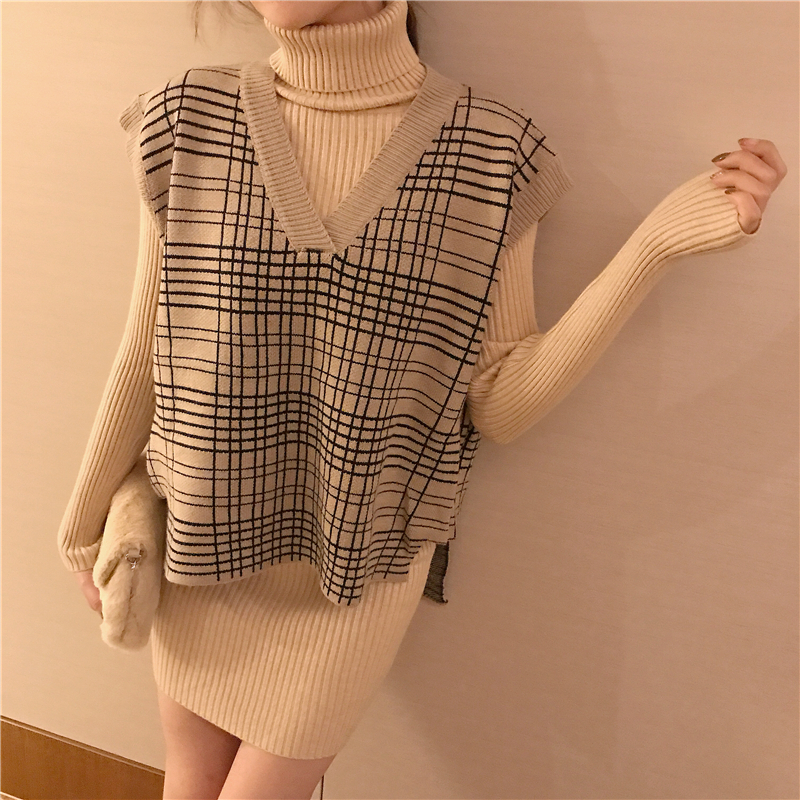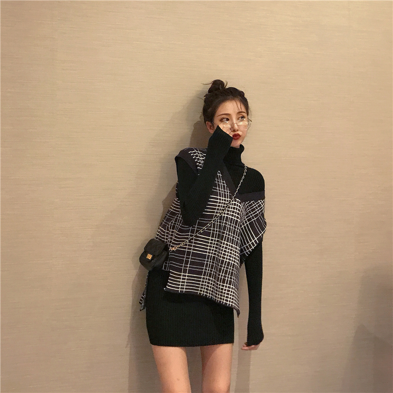 復古韓國chic格子包芯紗針織衫馬甲+高領加厚保暖修身針織連衣裙