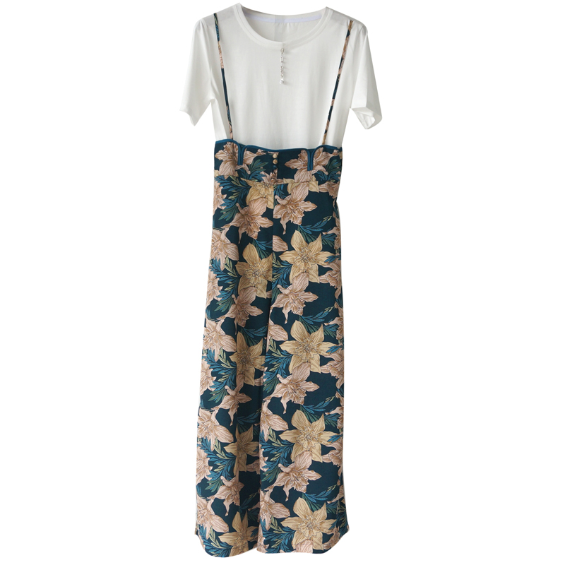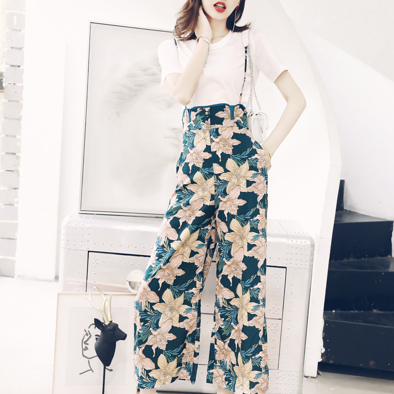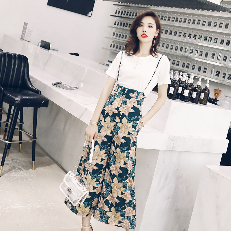 / S秀2018夏裝新款網紅氣質套裝短袖t恤兩件套印花背帶闊腿褲女