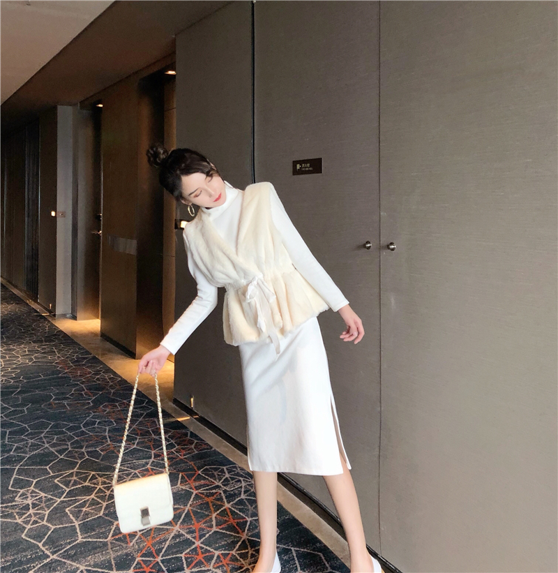 2018新款系帶毛絨背心馬甲長袖側邊開叉針織連衣裙時尚氣質套裝女
