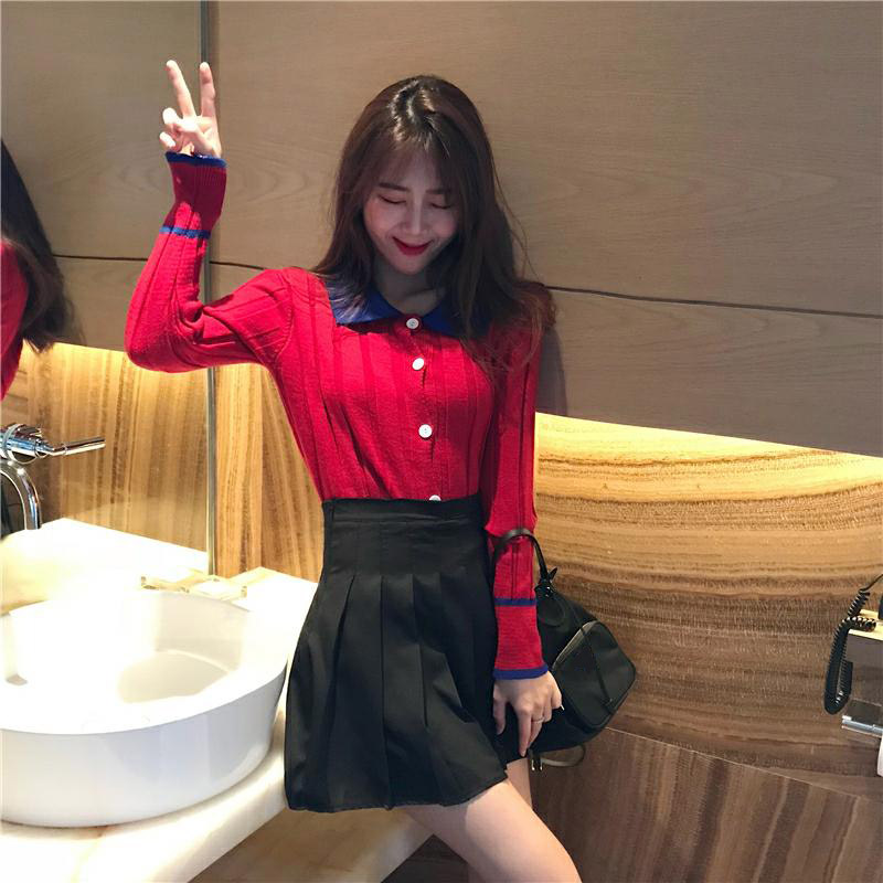 / 2018秋裝新款時尚套裝Chic撞色翻領慵懶風針織開衫百褶半身短裙女