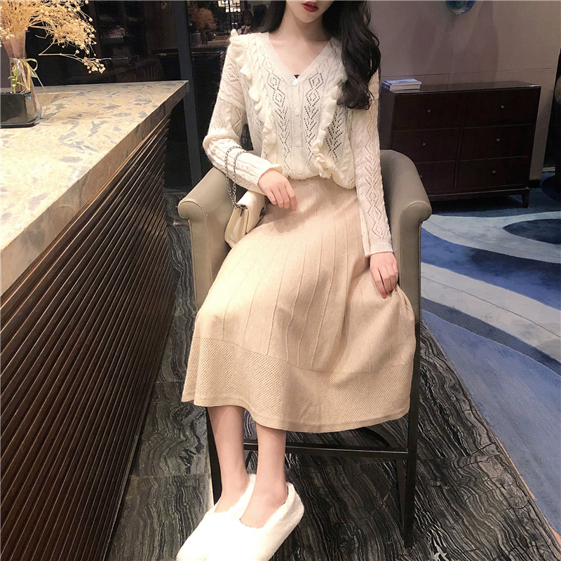 韓國新款復古風木耳邊毛衣開衫外套高腰針織半身裙時尚套裝兩件套