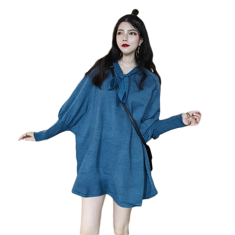 / 秋裝女2018新款氣質百搭針織連衣裙女秋燈籠袖V領系帶寬松裙子潮