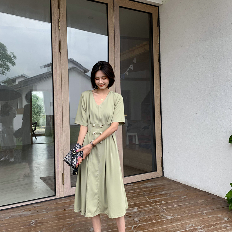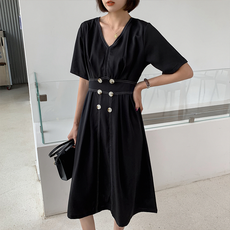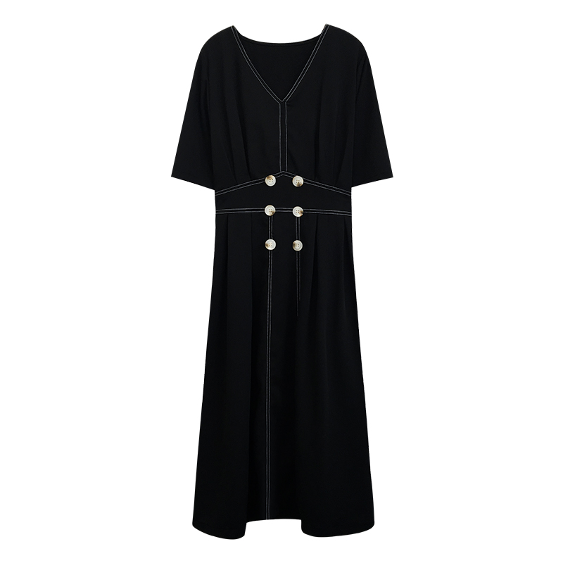 裙身前面的雙排扣裝飾打破了整體的寡淡感