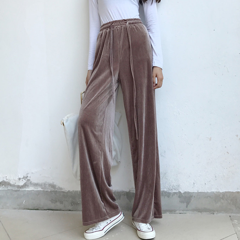 / 復古松緊高腰墜感金絲絨闊腿褲秋裝女新款學生寬松百搭休閑長褲子