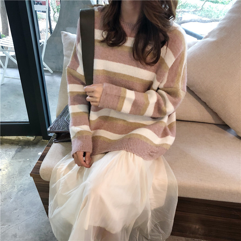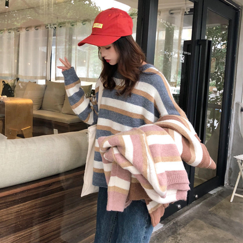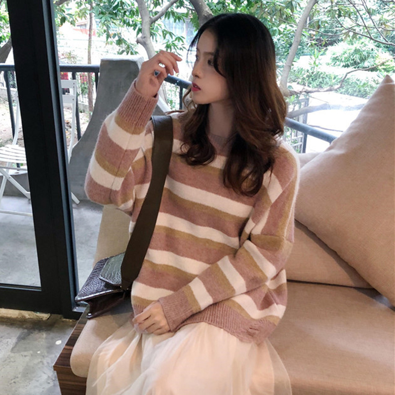 慵懶風套頭毛衣女秋裝2018新款韓版條紋寬松圓領外套學生長袖上衣