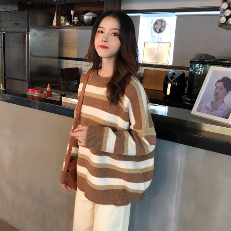 / 慵懶風套頭毛衣女秋裝2018新款韓版條紋寬松圓領外套學生長袖上衣