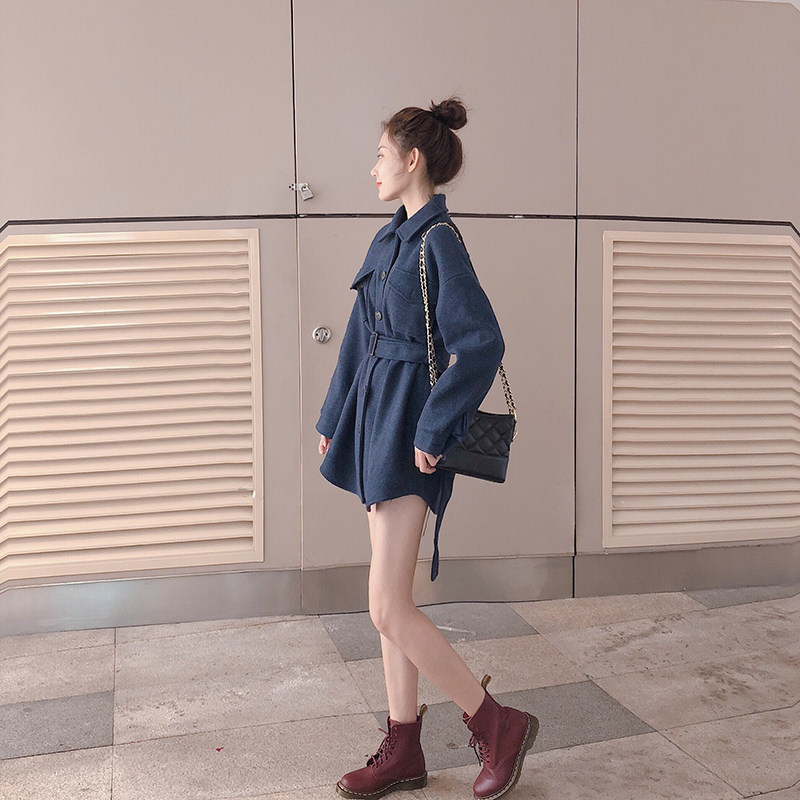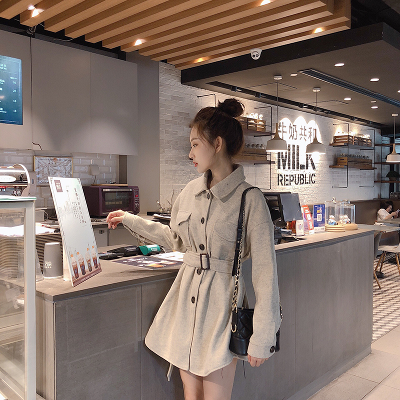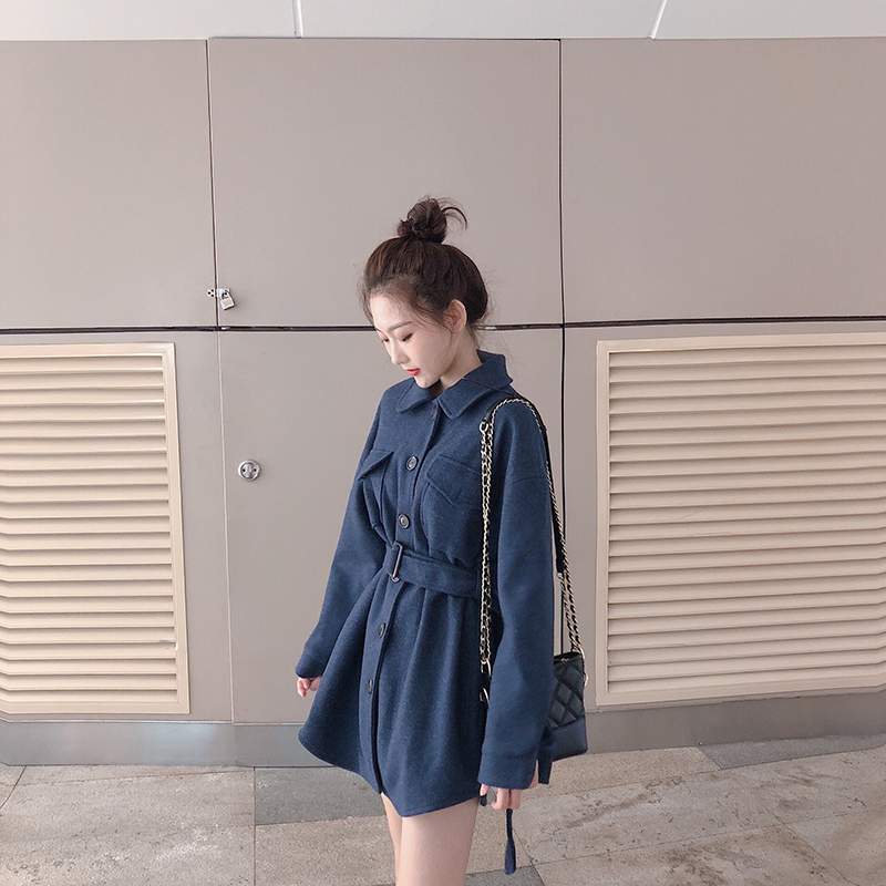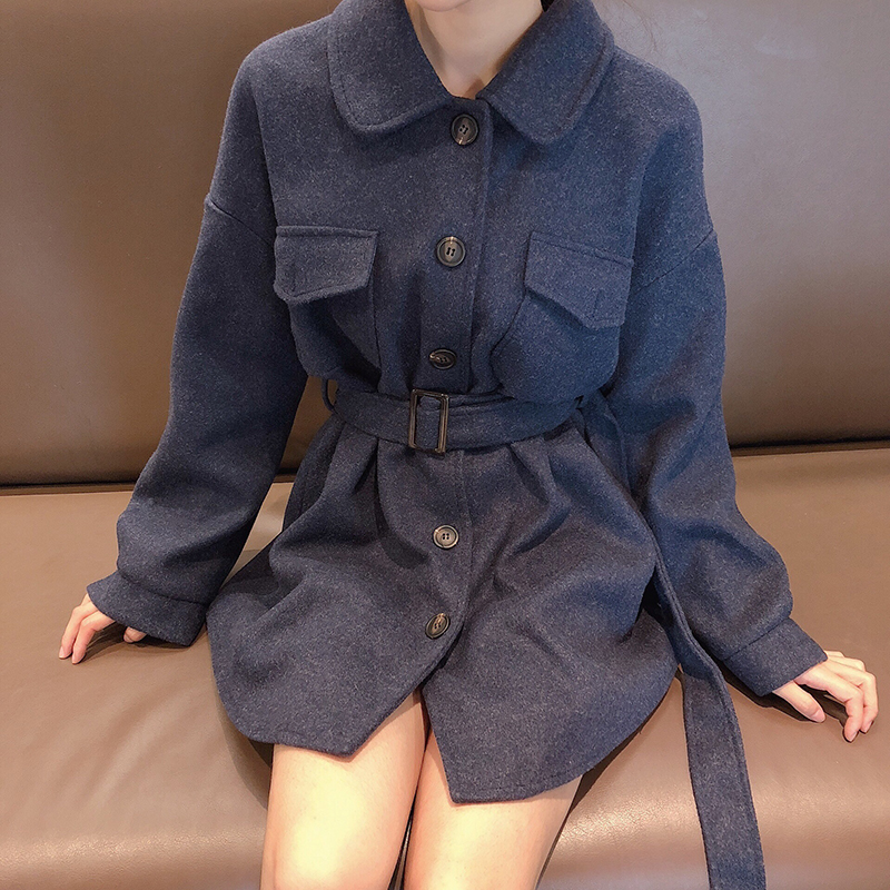 外套女春秋2018新款時尚chic簡約寬松顯瘦中長款呢子外套女配腰帶
