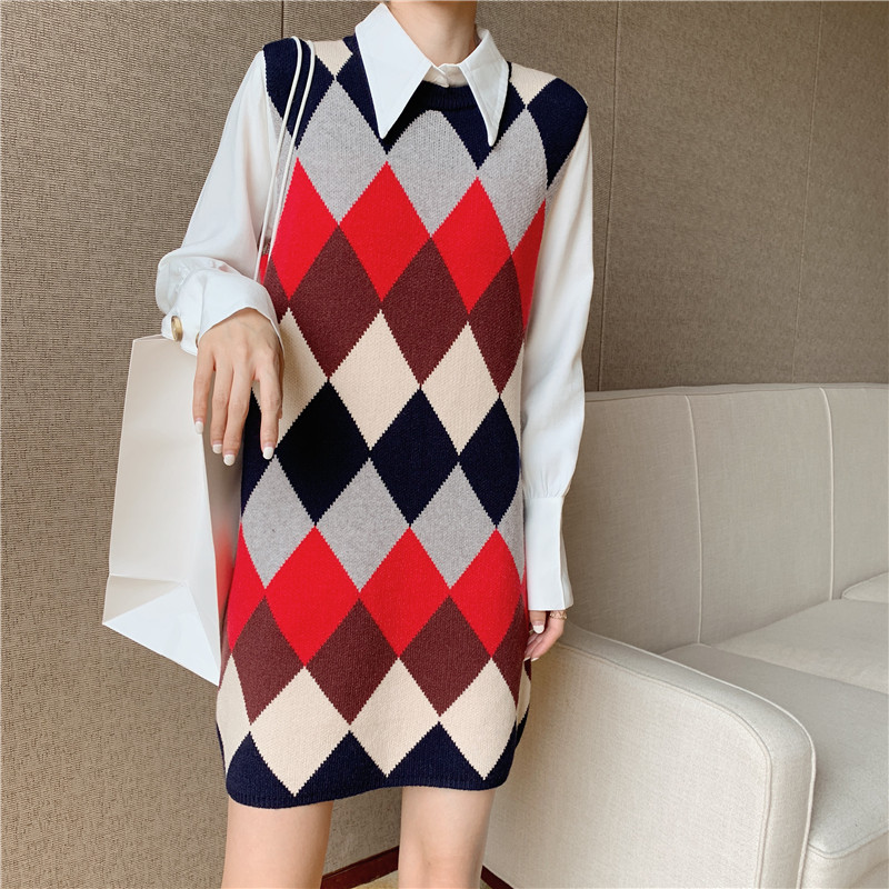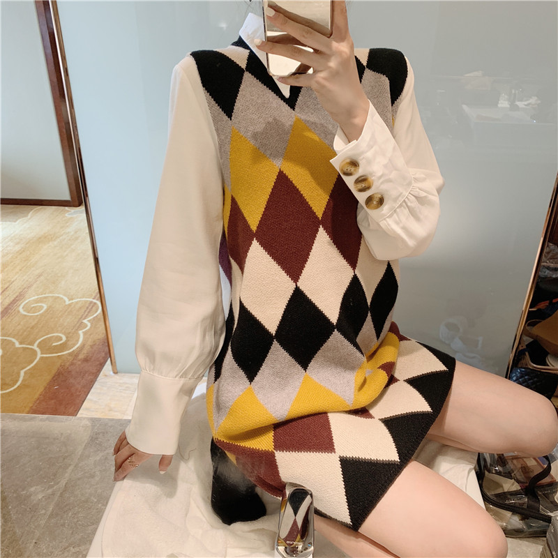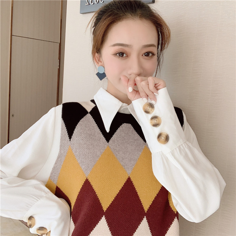 / 秋冬新款撞色菱形中長款針織馬甲時尚套裝翻領純色打底襯衫兩件套