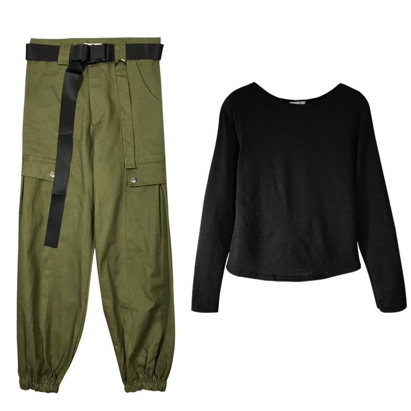 / 2018早秋新款兩件套裝港味長袖修身打底衫T恤+高腰工裝休閑哈倫褲