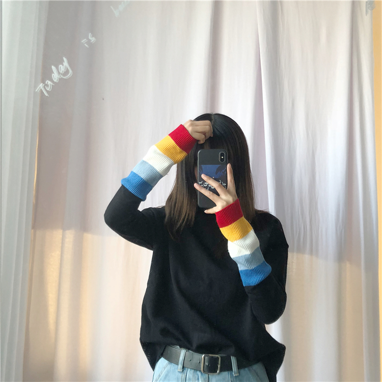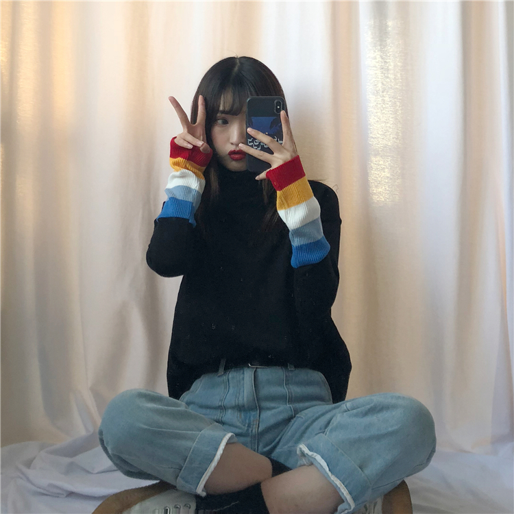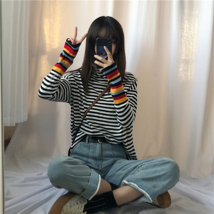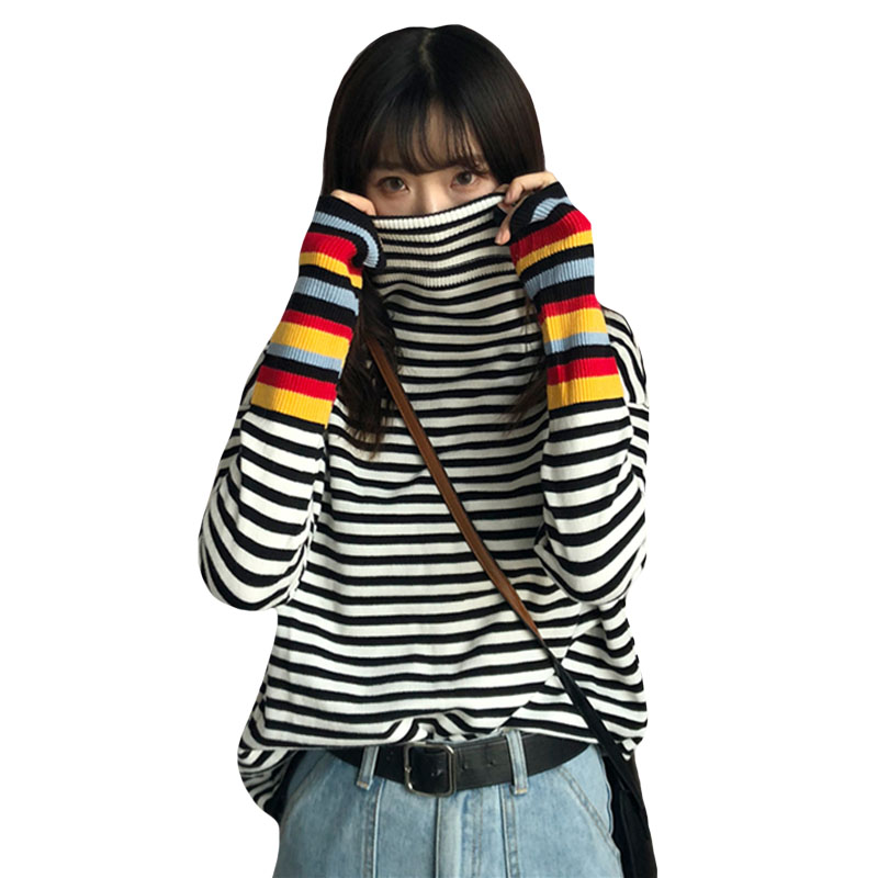 2018新款秋冬韓版高領彩條袖子打底網紅套頭針織衫毛衣上衣外套女