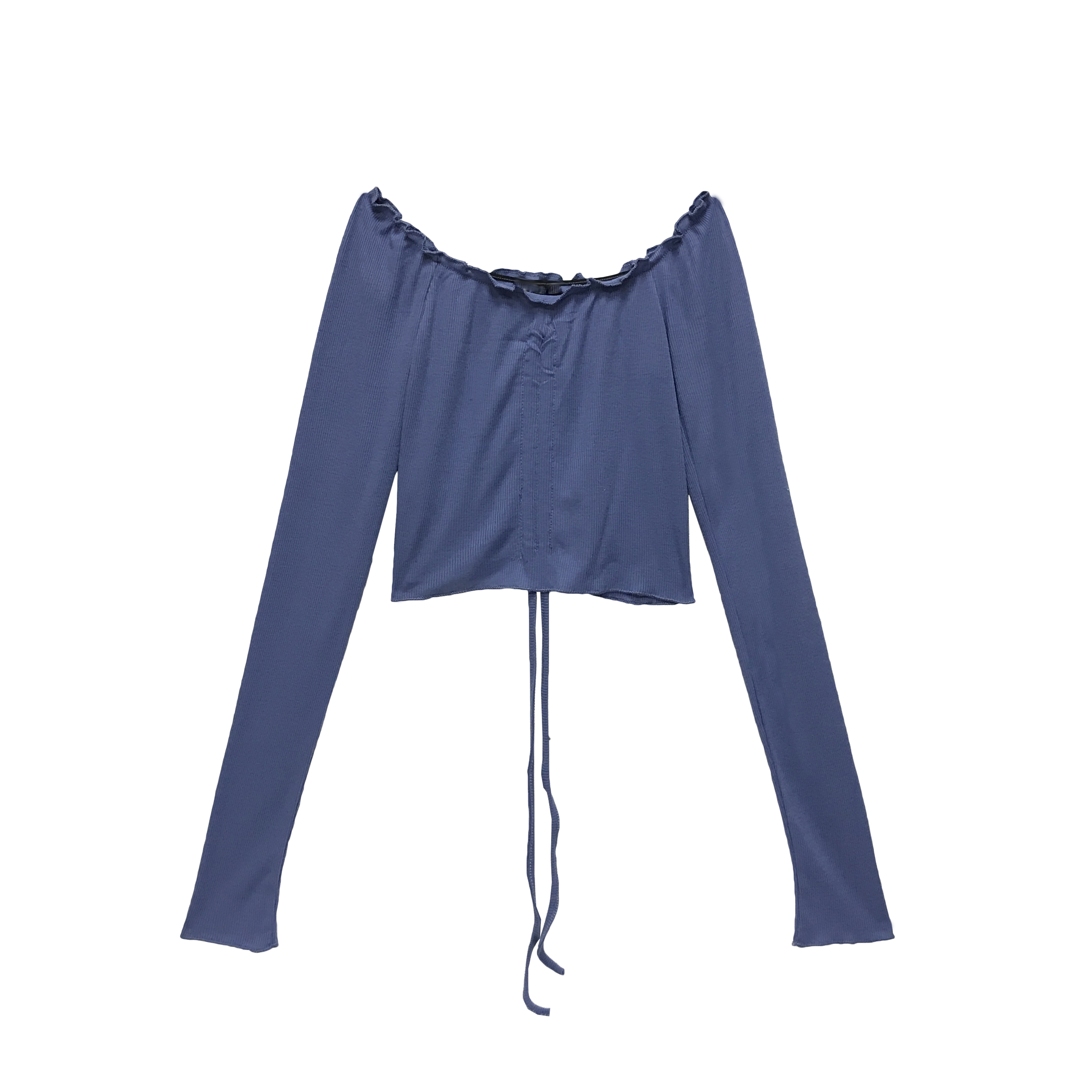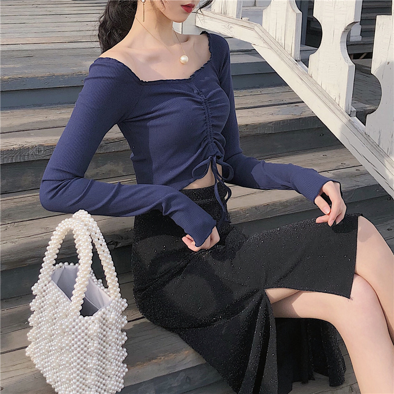 / 秋裝2018新款Chic溫柔氣質修身顯瘦T恤純色漏肩前抽繩百搭短上衣