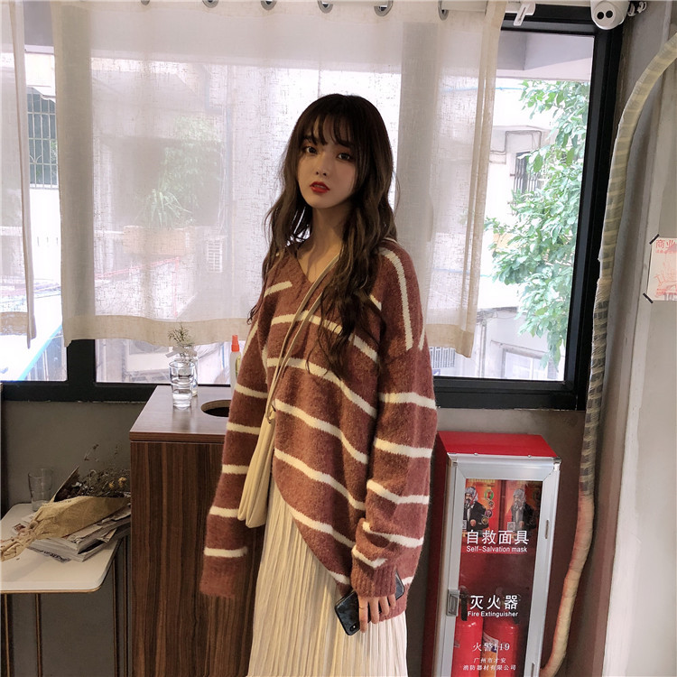 / 韓版時尚休閑套裝秋季女裝V領條紋針織毛衣外套+百褶半身裙兩件套