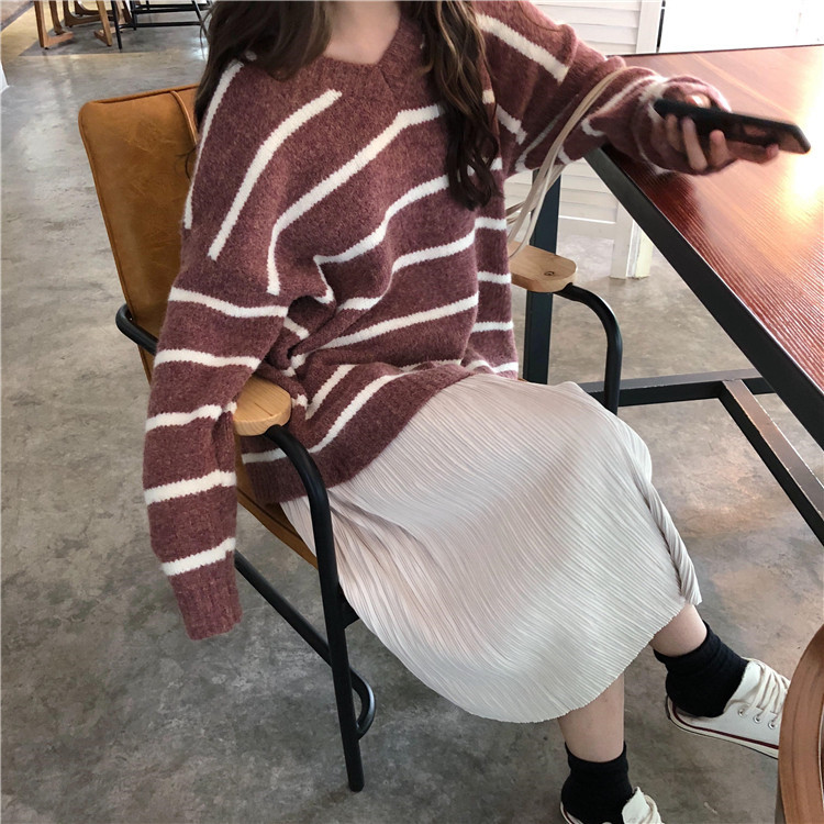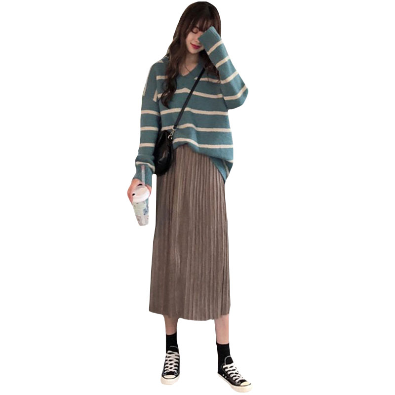 韓版時尚休閑套裝秋季女裝V領條紋針織毛衣外套+百褶半身裙兩件套